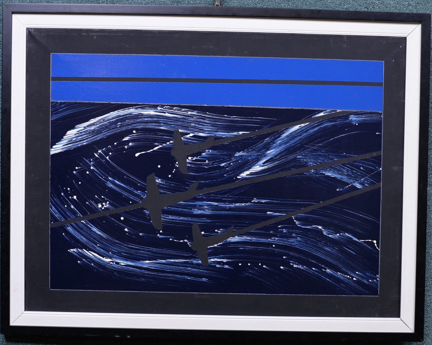 This profound piece is very much an anti-war message, specifically, the tragic bombardment of Angeli’s childhood Italian town, San Lorenzo during WWII. The artist lived through this life-altering event, but 3,000 citizens and most of the city’s structures, unfortunately did not. The grayed out aircraft flying over the foamy waves of the Mediterranean Sea are of course the bomber planes which dropped the devastation upon the town.
