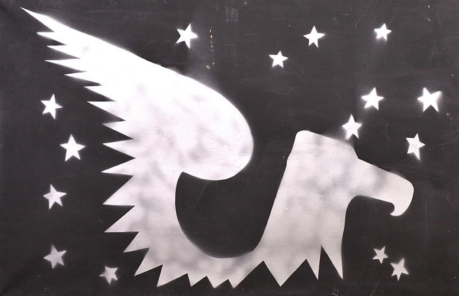 Angeli was poverty stricken throughout most of his childhood, largely due to the destructive aftermath of WWII in his home city of San Lorenzo. So, it should come as no surprise that the artist would possess resentment towards the practice of capitalism in other parts of the world as expressed using the American bald eagle. Notice also, that the surrounding stars (taken from the half-dollar) are on a black backdrop representing the vast emptiness of individual profit.