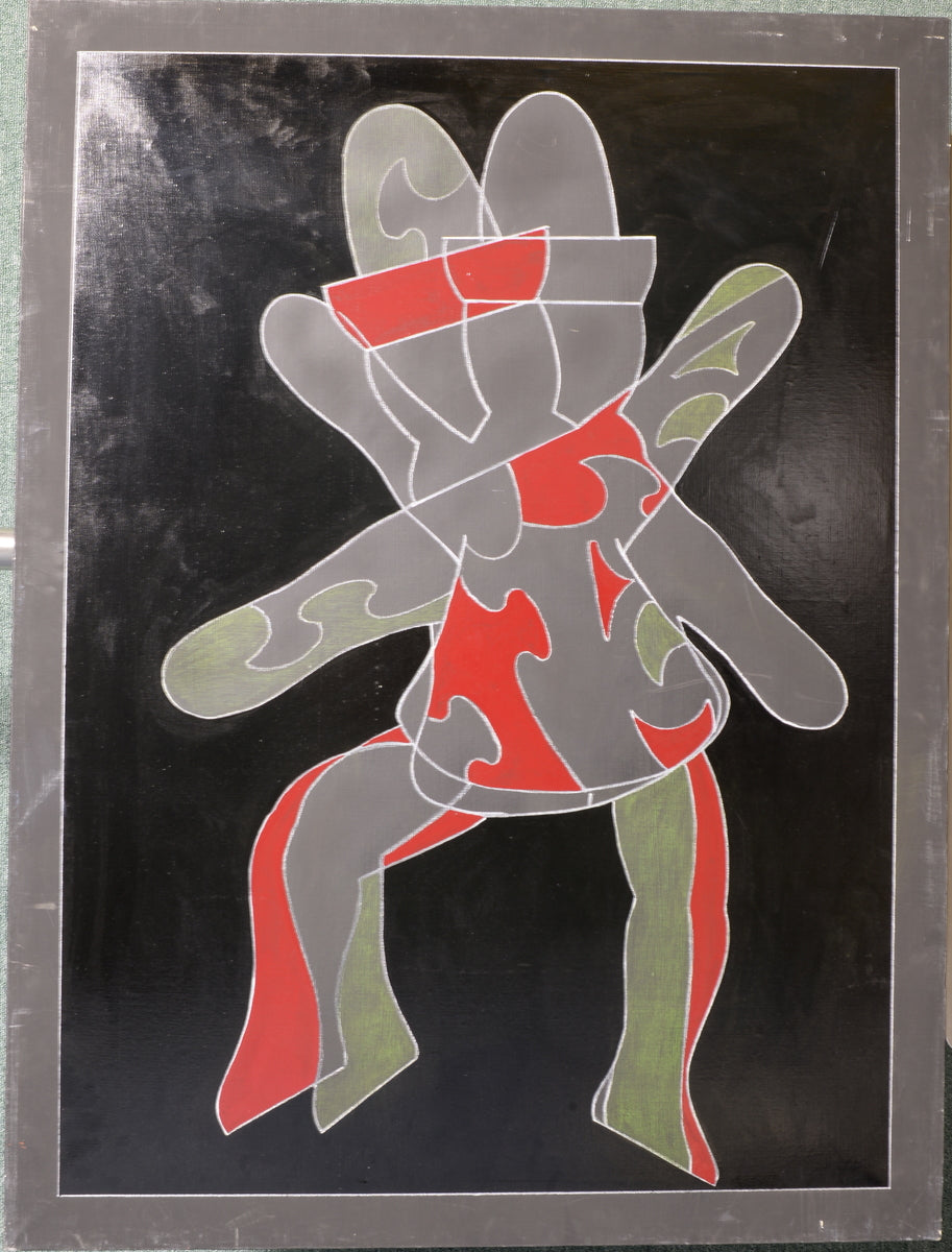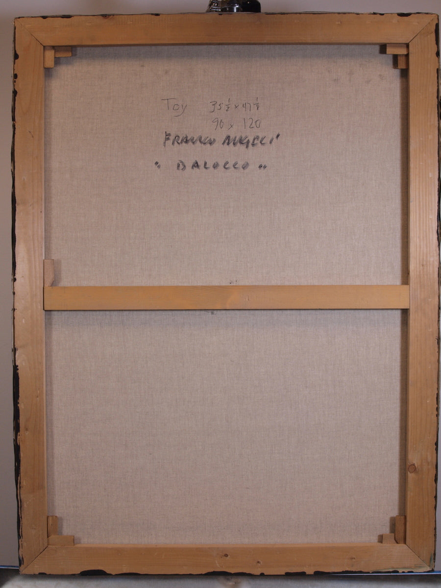 The Italian word Balocco translated means ‘Puppet.’ This is fitting for the artist whose core protests are rooted in socialism. To be a tool of the regime leads down the path of conformity. Also of note, is the two figures encase the colors of the Italian flag (red, green, white) which makes a bold statement towards Angeli’s own homeland