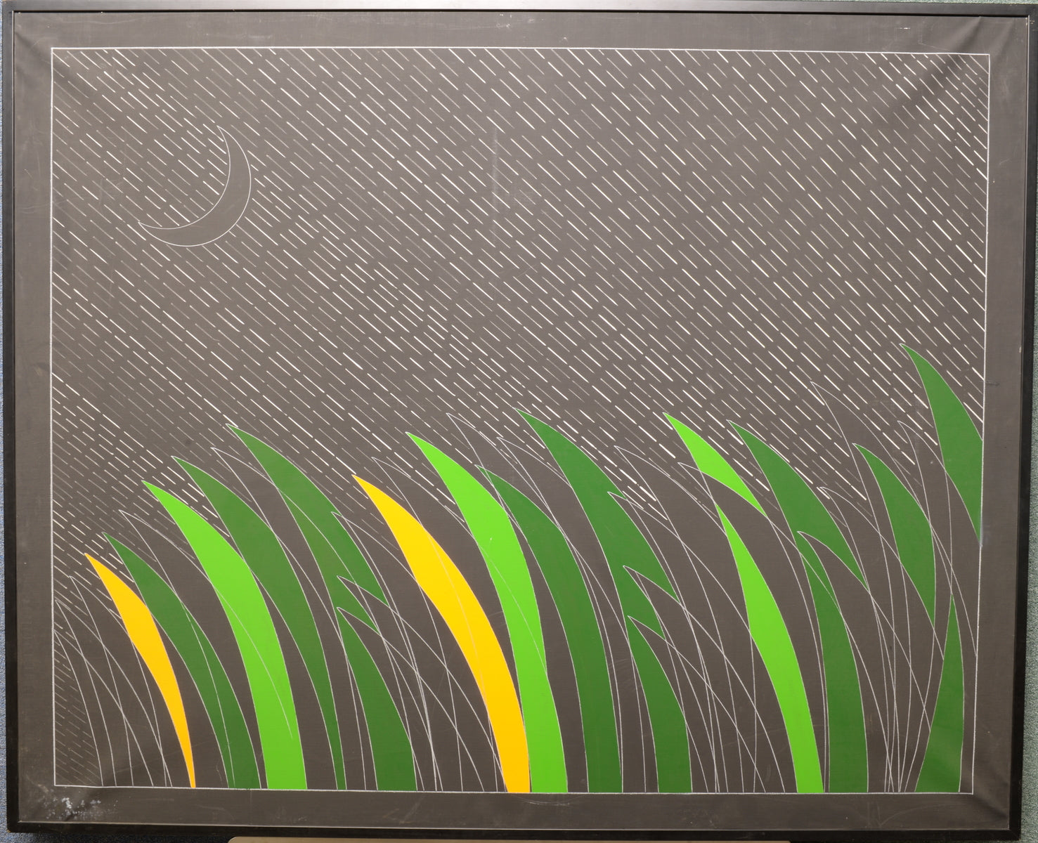 Blades of grass are a powerful symbol of unity and expansion. Here, Angeli incorporates this into his night time painting as a messenger of an impending uprising. “We must stand as one!” it seems to exclaim. Not all of the vegetation is green however. There are also blades of yellow (the reluctant ones) and gray (the fallen). The crescent moon shining in the sky represents the Roman goddess Trivia who was the underworld goddess of witchcraft. She wandered around at night haunting crossroads and graveyards. Powerful imagery here.