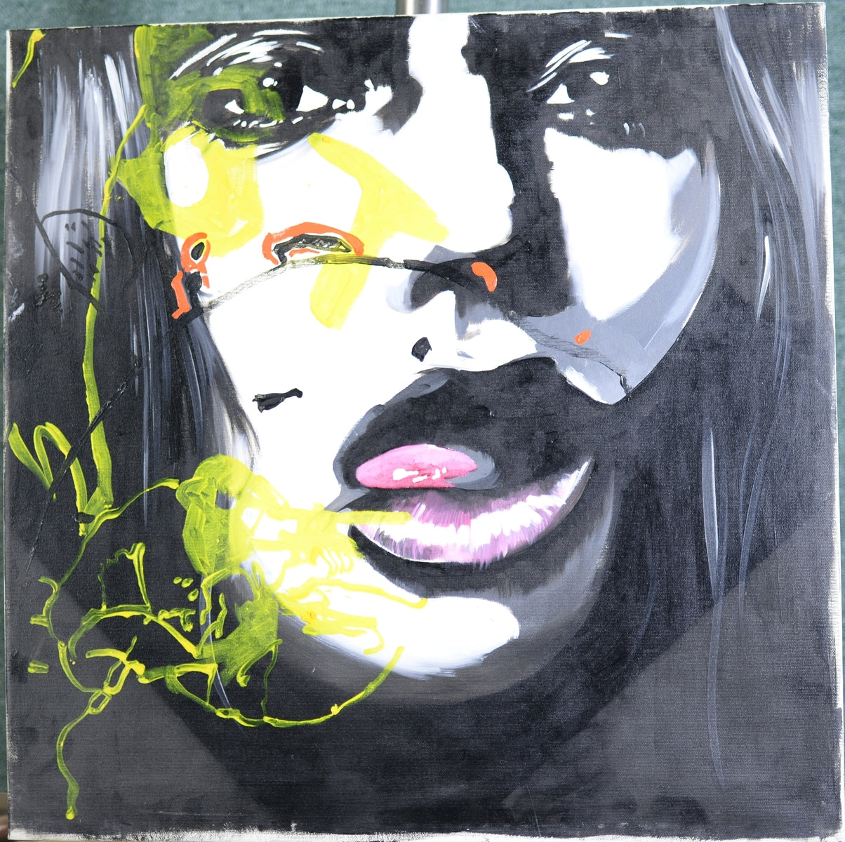 The model’s tightly focused lustful expression presented in glorious grays and whites and blacks is as sensual as it is provocative. Bachis’s artistic knack for capturing mood with minimal color is evident all over the canvas.