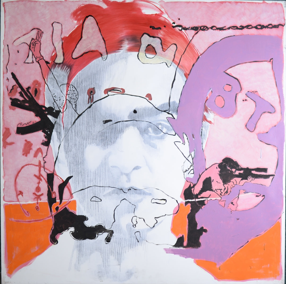The faded woman hidden amongst the painted “scraps” is the late Spanish painter Frida Kahlo. A tribute of sorts by Lidia Bachis as well as a subtle statement towards empowered women (via the images of gun toting freedom fighters). There’s a minimal color palette that permeates every facet on the canvas.