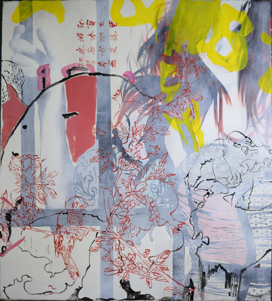 One could ponder over this work for hours at a time due to the staggering amount of content contained within the canvas walls of this Lidia Bachis piece. All of her signature nuances are present such as the red flora, the strong female figure, Asian influence, and many others. Never have they all been represented in one collage like this before, which makes it particularly provocative.