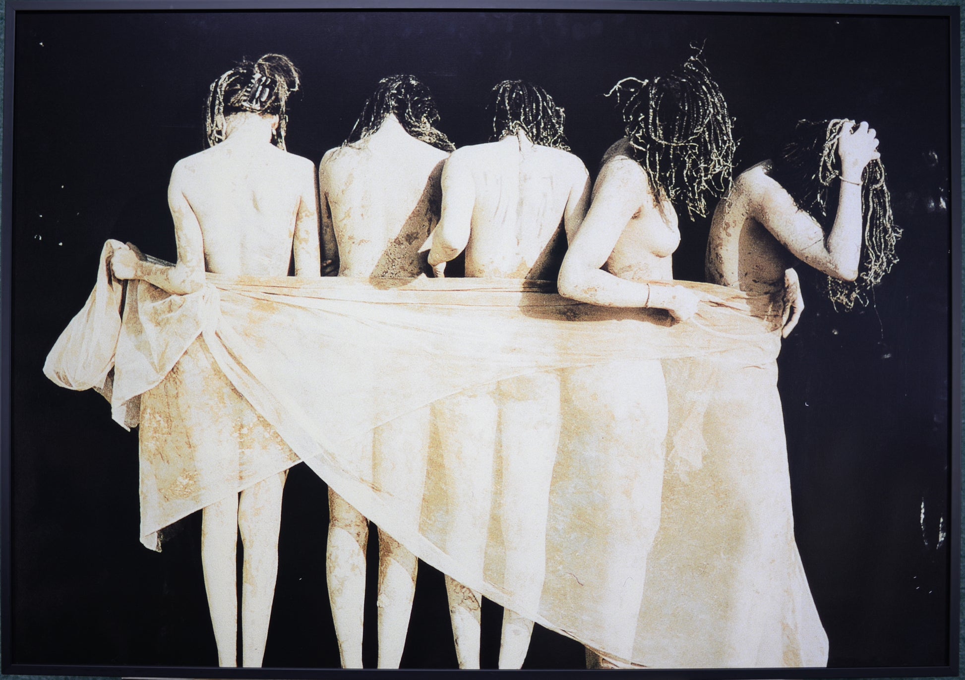 Five women minus three women is two women. The two distinguish themselves from the other three by refusing to face the dark wall head on and break from the norm.