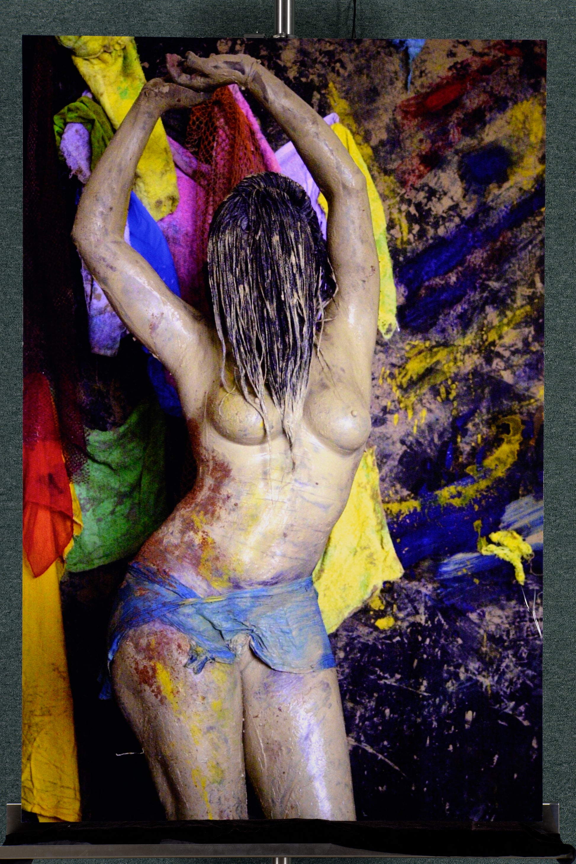 She stretches before a backdrop streaked with color, unafraid to expose her slender gray-skinned body.