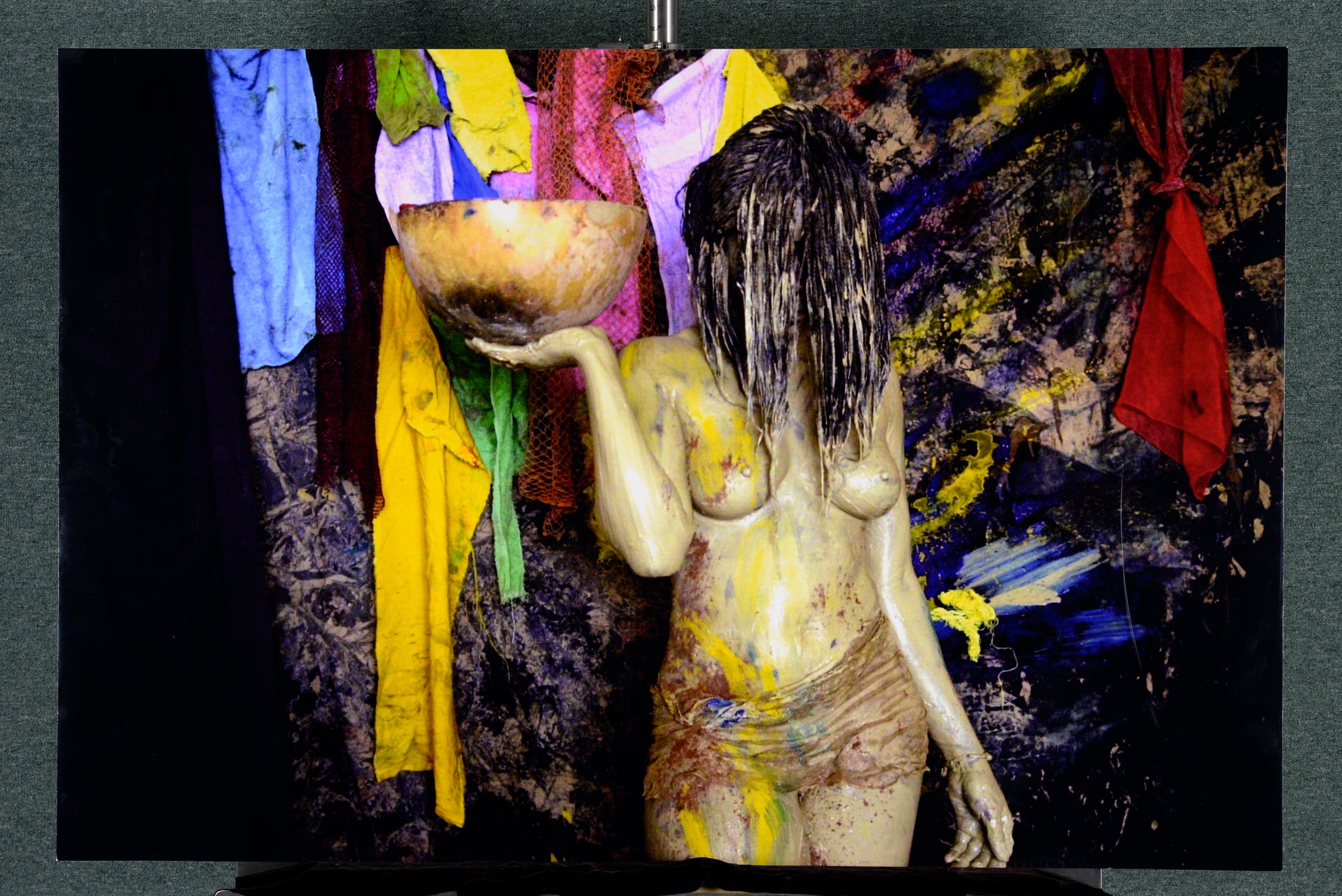 In front of a darkened backdrop lined with strips of cloth, she serves up the clay bowl like a waiting sacrifice in front of a darkened backdrop lined with strips of colorful cloth. Her expression, like the contents of the bowl, is an enigma. Dago is an artist from Senegal. The cibachrome print is mounted on Aluminum ready to hang.