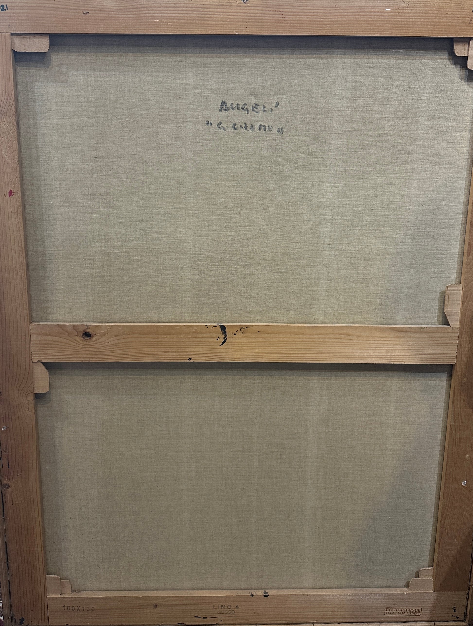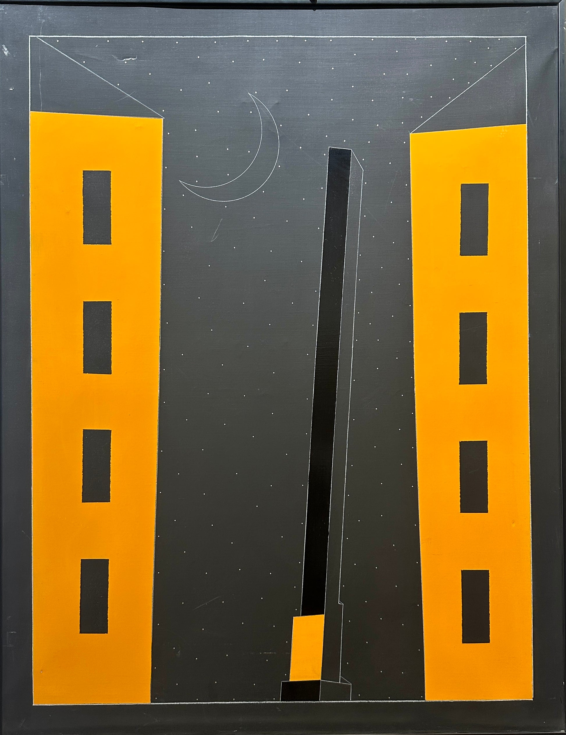 A stunning painting features two yellow rectangles that resemble buildings, each with "windows" cut out. Delicate white lines delineate the structures, while a luminous moon and scattered dots evoke a starry sky.