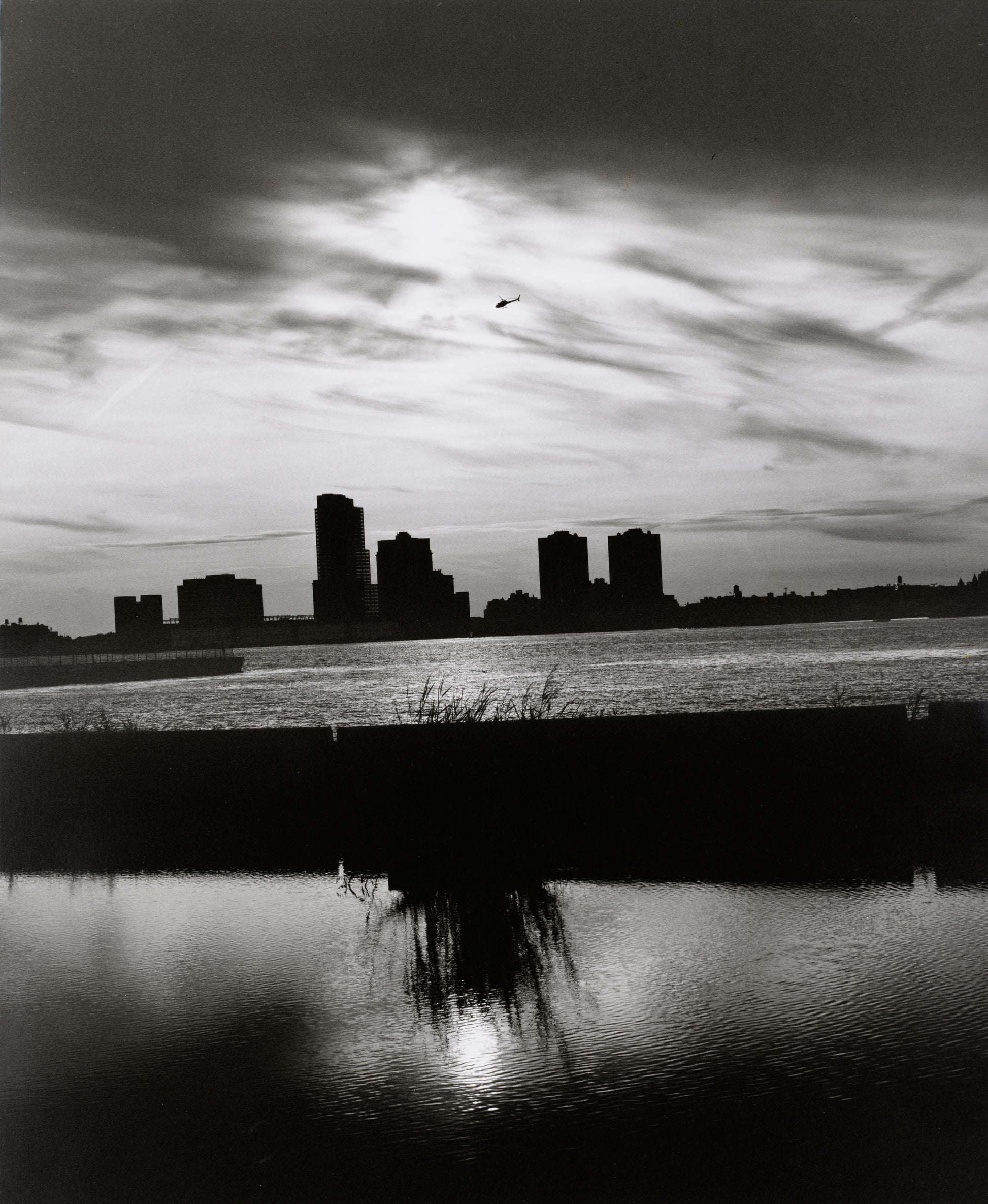 This is a Silver Gelatin Print by Italian photographer Antonio Guccione A blooming overcast of sky and sun illuminates the calm waters of the Hudson River and darkens a portion of Greenwich Village residing in the distance.
