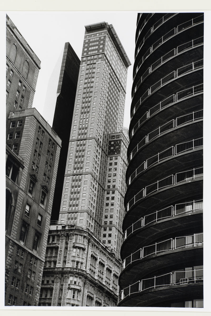 In New York, circa 1992, Guccione produced a collage of photographs depicting some of the city’s varied architecture including these monoliths of steel, glass, and concrete reaching for clear skies. The cylindrical building in the foreground provides a dark, contrast to the center structure. This flirting between light and dark is celebrated for decades in his work.