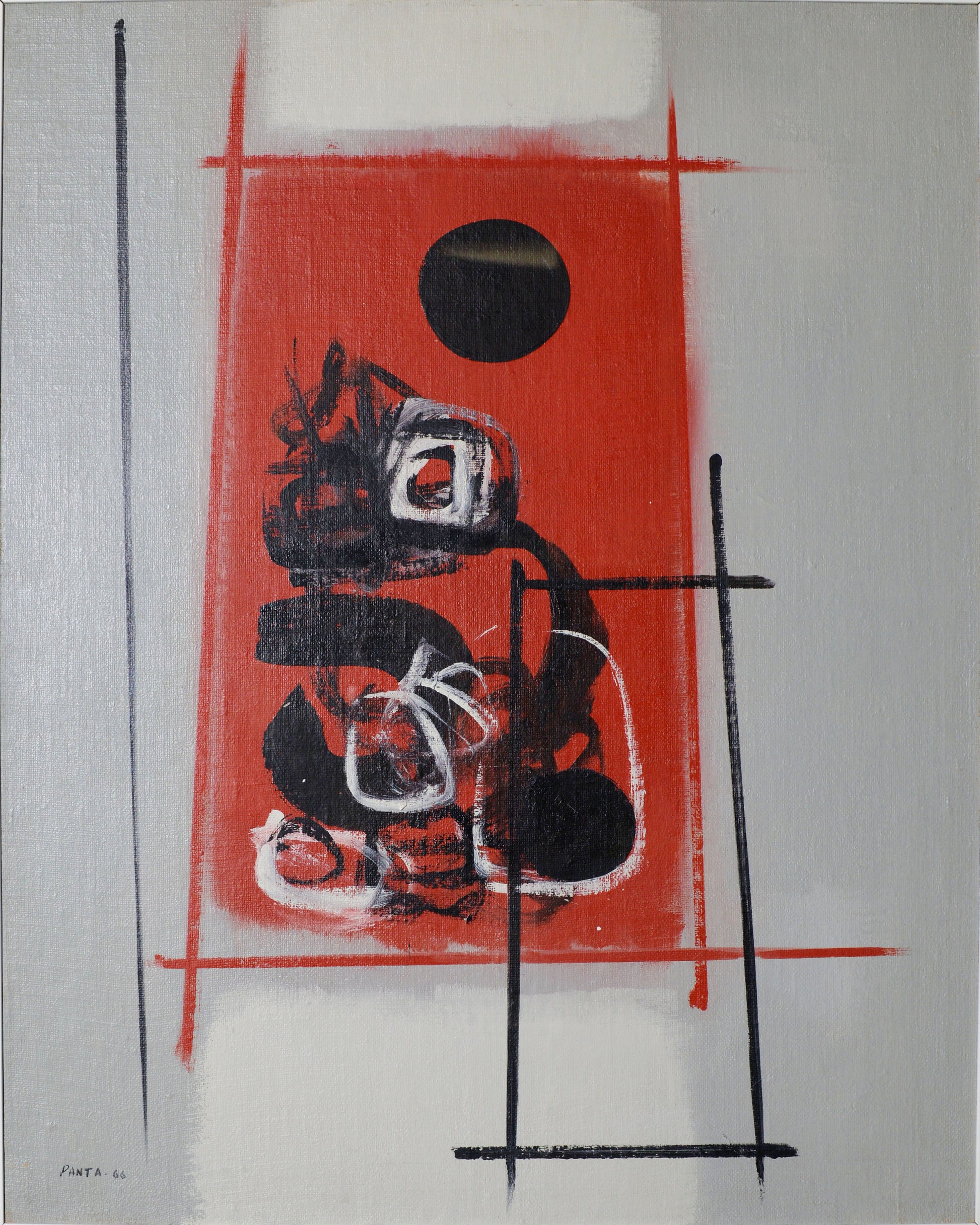 This is a oil on canvas painting by Italian artist Ideo Pantaleoni. Made in 1966, this is an abstract piece known as "Black Calligraphy on Red". The main focus of the painting is a giant red block that is against a mostly grey background. On the block itself is a array of odd images that are either in black or white. This piece has been signed by Ideo Pantaleoni himself.